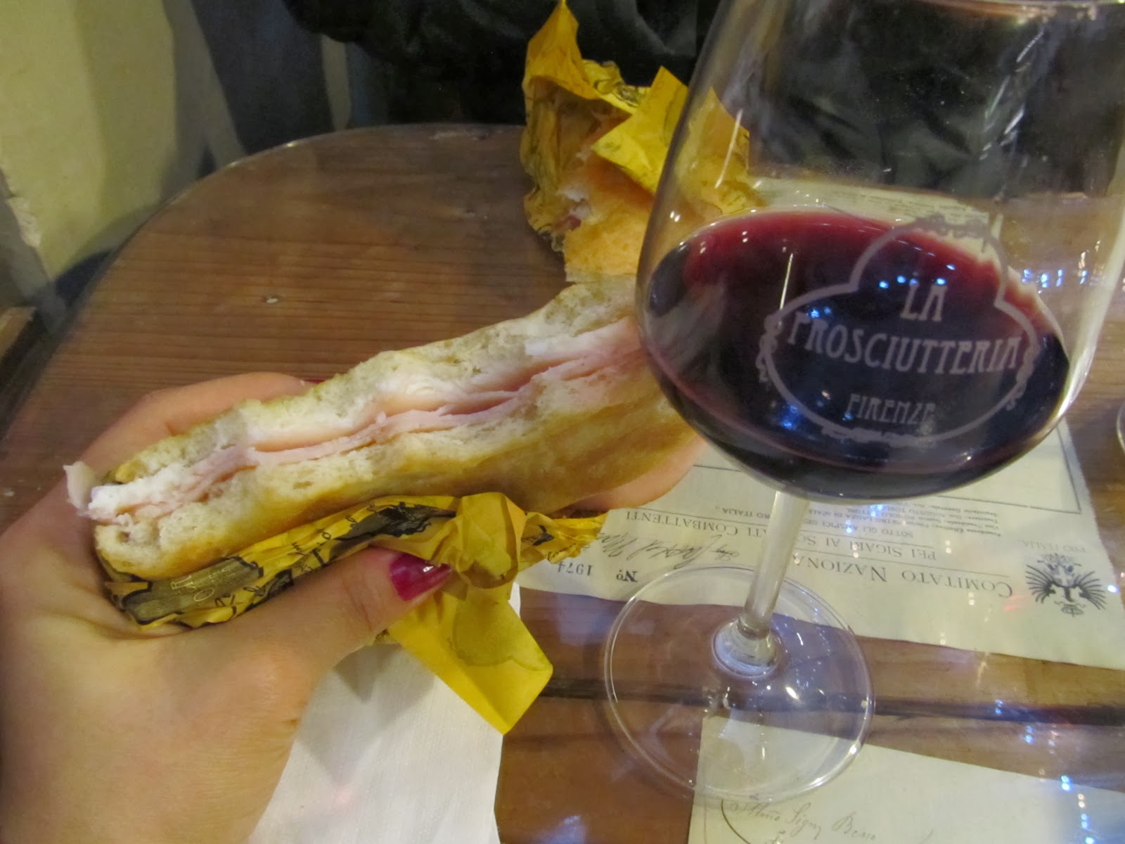 Toskana bölgesinin Başkenti sayılan Floransa'da Toskana bölgesine has tuzlu, çiğ domuz salamı en fazla tüketilen besin. Domuz olması bir yana, salam olması bir yana, deli gibi tuzlu olması başka bir yana, bizim hiçbir şekilde midemizin kaldıramayacağı cinsten. Bu çiğ salamlarla peyniri bir ekmeğin arasına koyup, şarap ile öğün olarak tüketiyorlar. Bu bölgede makarna ve pizza dışında bizim damak zevkimize uygun bir şey bulmak çok zor anlayacağınız. Zaten biz de 3 gün boyunca sadece makarna ve pizza yedik :) İlk gün, Uffizi'ye girmeden önce, Tripadvisor'da puanı en yüksek şarapçılardan birinde oturduk öğlen atıştırması için. Dediğim gibi, atıştırmalık sandviç dışında bir şey bulamazsınız. Biz de acı bir tecrübe ile fark etmiş olduk bu durumu. Mekanın adı La Prossuciteria. İçinin çok hoş, otantik ve geleneksel bir dizaynı var. Kendi şaraplarını yapıyorlar birçok mekan gibi. Şarabını beğendim açıkçası, eh bu avrupalılar bizim aksimize, alkol konusunda cömert oluyorlar genelde. Yalnızca 1 kadehten sonra hafiflemiş bir kafa ile Uffizi'yi dolaşmak çok hoş oldu :)